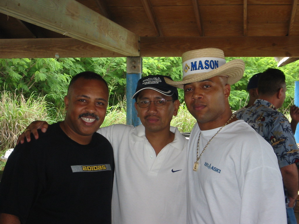 Masons Working Together in UnityIn May of 2003 three Masonic Lodges in Puerto Rico came together determined to work as one. Worshipful Master Alan Moore of Diversity #328 (Right), Raul Martinez of More Light Lodge #105 (Center) and Worshiful Master George Mayers of Panama Canal Lodge #174 ( Right) met to discuss working together in the community as one group of Masons instead of several differnt lodges. The three lodges celebrated the decision by holding a family Day picnic where all the members and their families gathered as one. We discussed plans to hold joint fund-raisers, sponsor join functions, present joint donations to the community, and hold joint family functions.